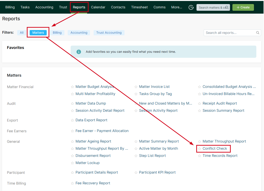 - In Actionstep Practice Management, go to Reports > Matter Reports > Conflict Check. (You'll find it in the General section of the Matters report list. If you don't see this report in the list, ask your administrator to check your report permissions.)