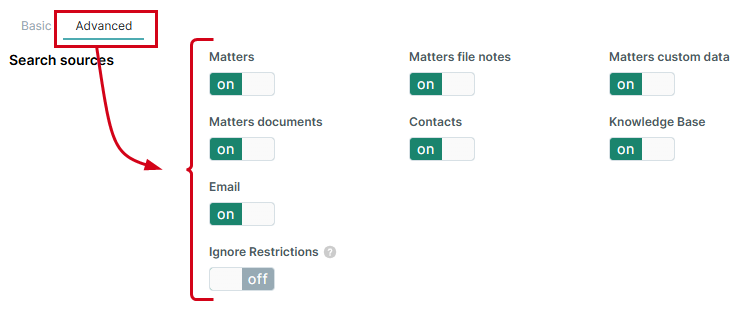 NOTE: To search for multiple names at once, enter OR between search terms (for example: John Smith OR Jane Doe) — this will find results where either name is present. Searching multiple names separated by a comma (John Smith, Jane Doe) will only bring up results where both names are present.. - Click the Advanced tab. The view changes to show the different parts of your system you can search.