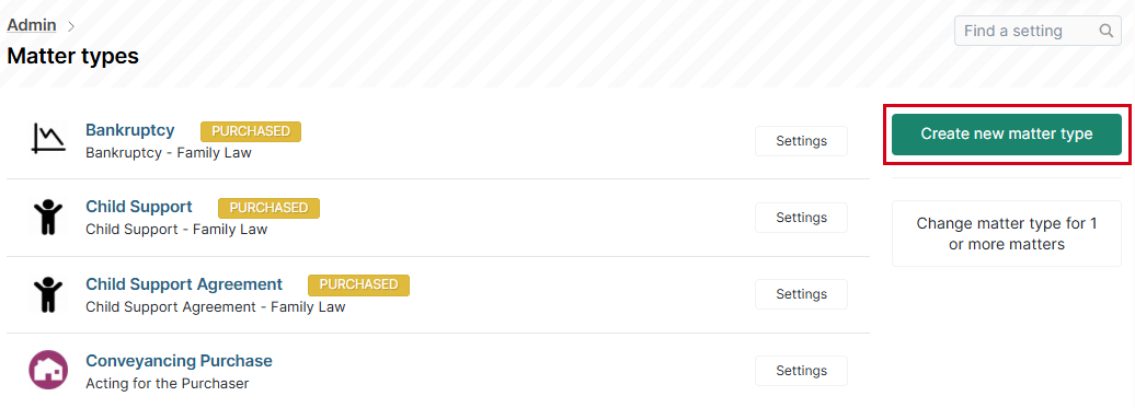 This article covers creating a new matter type; however, you can also use these instructions to edit the settings for an existing matter type. (You can do this by going to Admin > Matter Types and then click Settings for the matter type you want to edit. Then, click Edit for the Matter type settings section.)