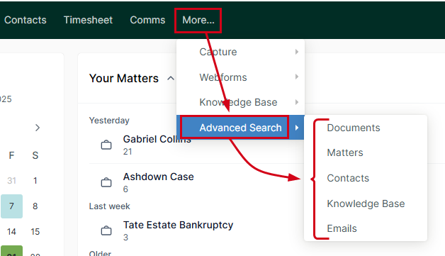 - In Practice Management, click More in the main menu and choose Advanced Search, followed by the type of information you want to search for: Documents, Matters, Contacts, Knowledge Base, or Email.