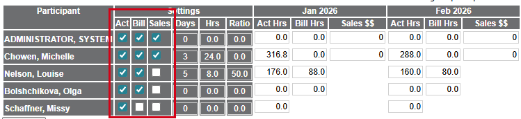 - If you select the Sales setting for a participant, enter the amount of fees that should be invoiced in the Sales $$ field for each month.
