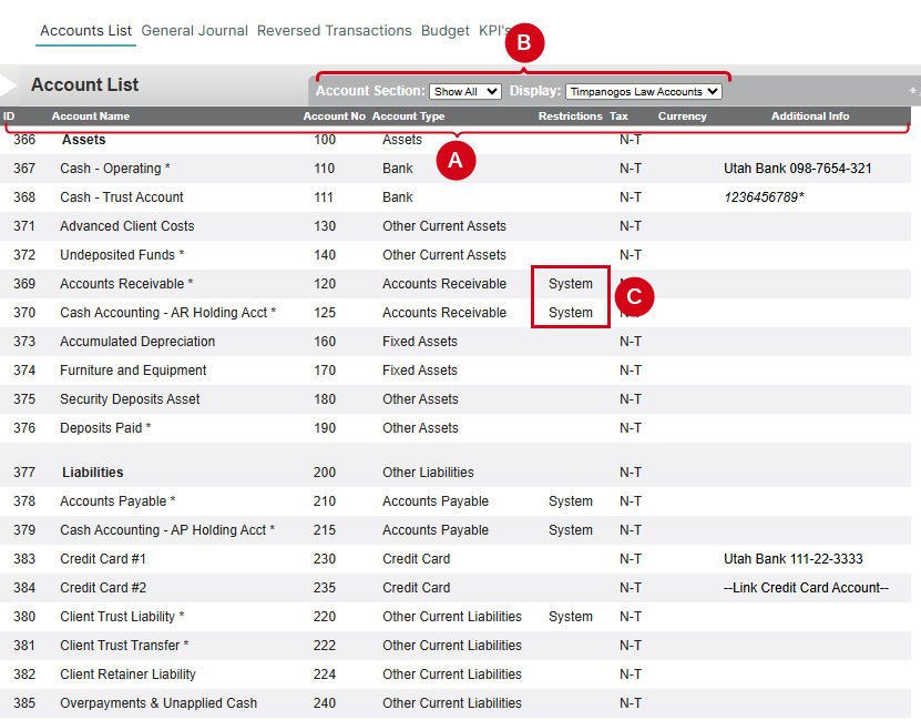 - Restrictions: This column indicates whether there are any restrictions on this account. Types of restrictions are explained in section C, below.