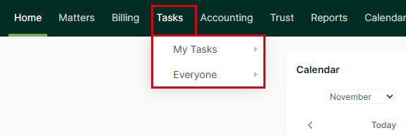 - Click Tasks in the main menu. Then select the type of task you are searching for (e.g., Incomplete, Due Today, Overdue, etc.).