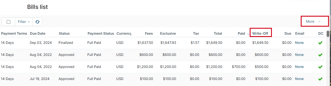 Finally, you can export a list of write-offs to Microsoft Excel by going to Billing > Bills List. This creates a list of every invoice in your system (which includes write-offs). You can then click the More drop-down list and choose Export. You can group write-offs in the list by clicking the Write-Off column heading, either before you export or after. (This sorts and groups the data.)