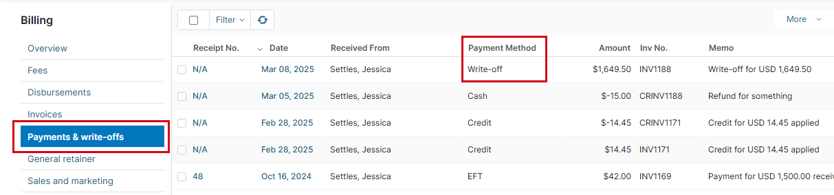 You can also find matter-specific write-offs by viewing the matter, clicking the Billing menu icon, and then clicking Payments & write-offs.