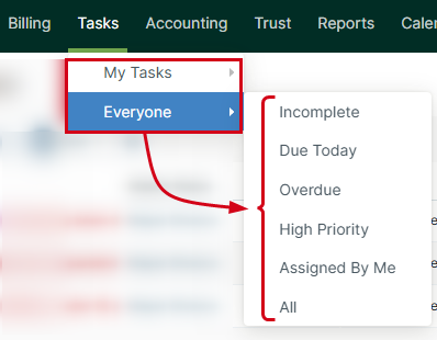 Tasks are largely divided into two categories: My Tasks and Everyone. You can view your own tasks (and others' if you have the correct permissions). Within each of these categories is a submenu with the same set of options as listed below: