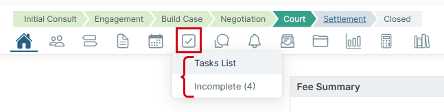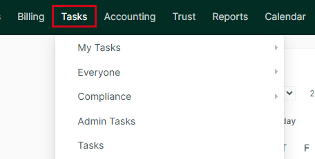 In Actionstep, click the Tasks menu in the main menu. The menu expands to show additional options.