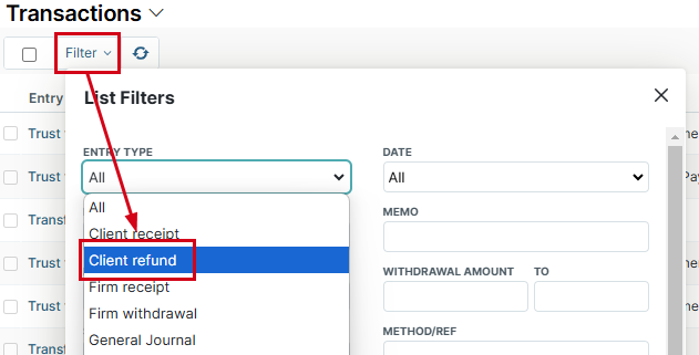 - Click the Entry Type drop-down list and choose Client Refunds. This will give you a list of all refunds.