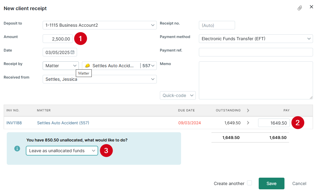 When you create a client receipt, you have options for determining how you want to process the unallocated funds: