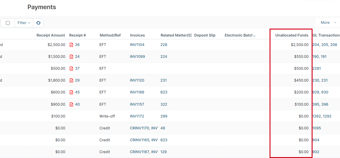 There are several different ways you can work with these unallocated funds, including allocating the funds when you process the client receipt, applying funds to other invoices, or refunding the client.