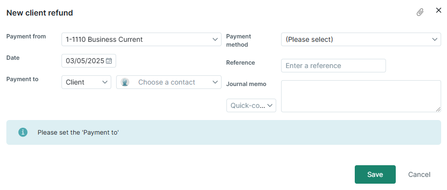 - Click Save to save the changes and process the refund. You must then physically refund the money back to the client.