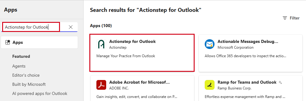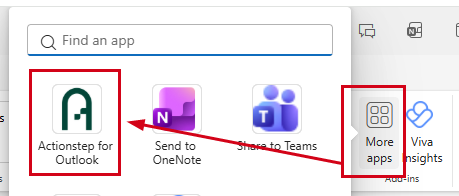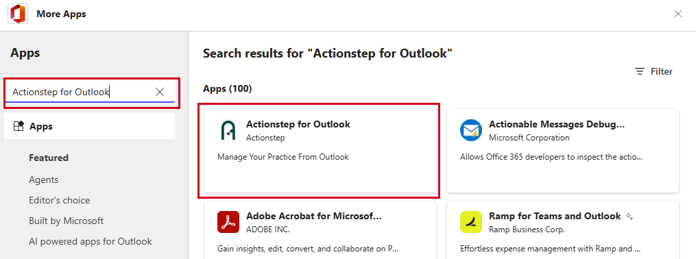 - In the Search apps and more field, enter Actionstep for Outlook.