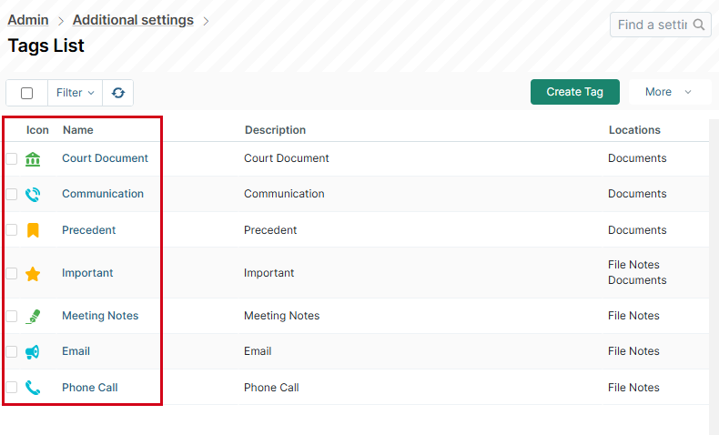 Tags are the ability to identify an object in your Actionstep system. Tags can be assigned to contacts, tasks, custom data, documents, and file notes. In most cases, tags are used to categorize these different components. When working with tags, you can assign an icon to a tag so that you can more easily identify what kind of tag it is.