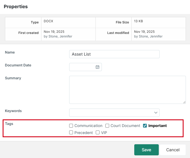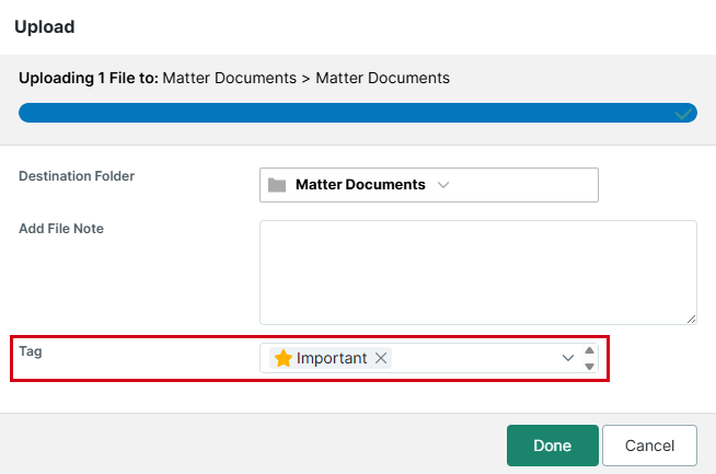 You can assign a tag to a document when you're uploading it to a specific matter: