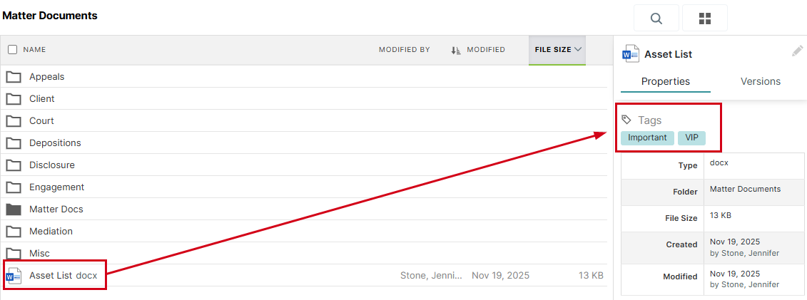 Tags assigned to a document are viewable on the Documents tab when the document is selected:
