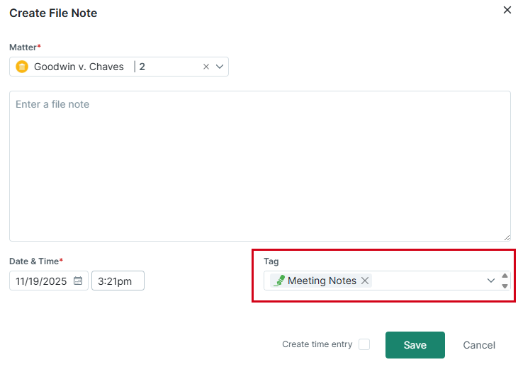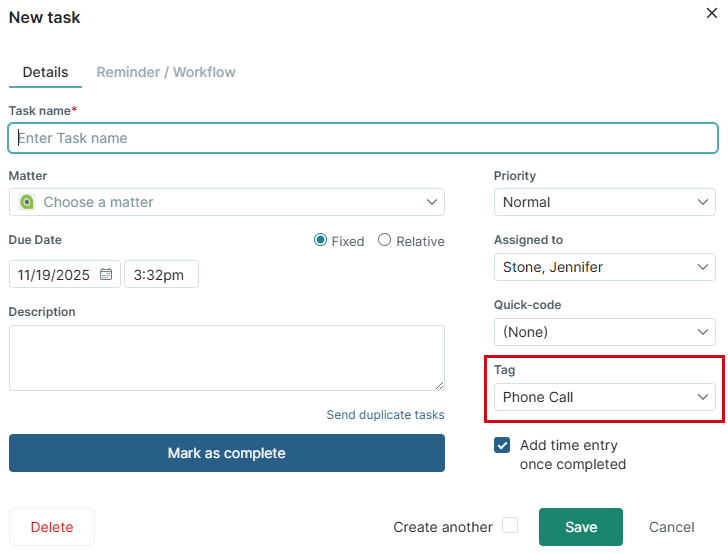 - Parent Tag: Optionally, click this drop-down list to choose a category you want to group similar tags under. For example, you might have a Client Contact tag that includes Phone call, Meeting, and Email tags as part of it. This field is optional.