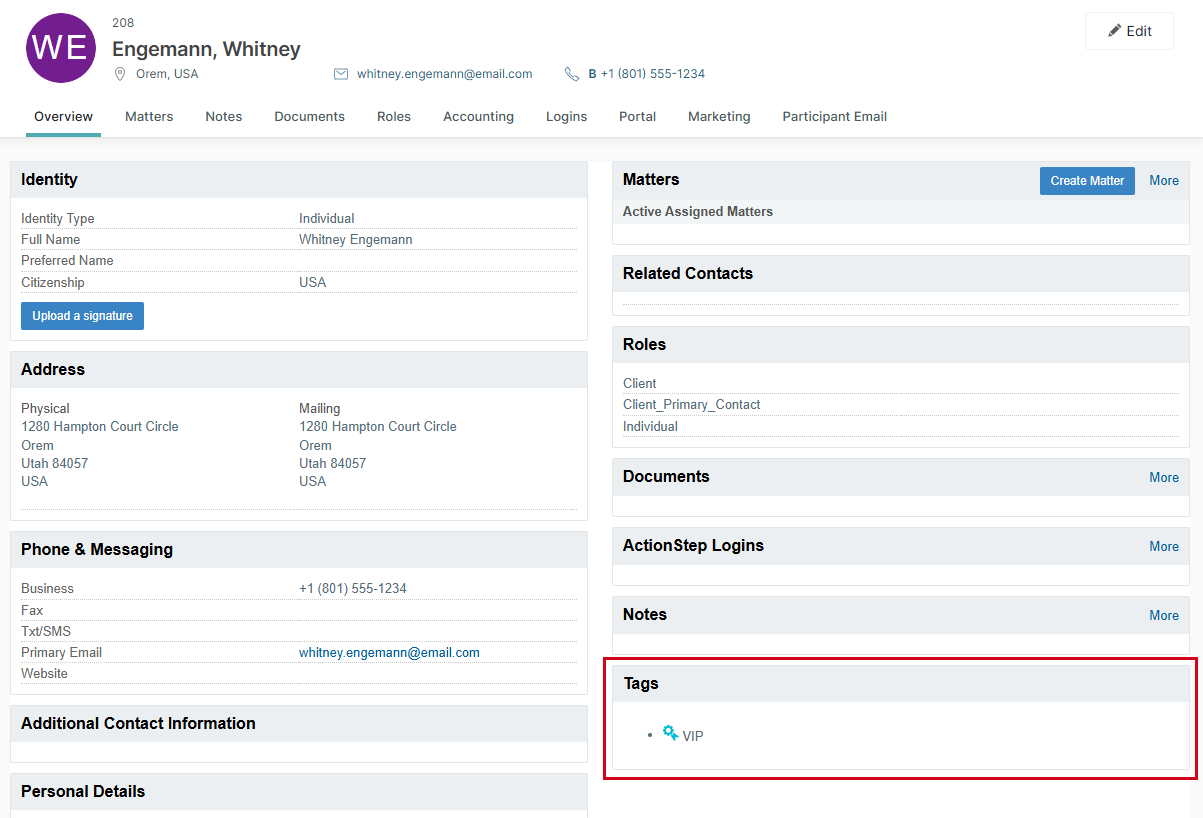 You can see tags assigned to a contact by viewing the contact record in the matter.