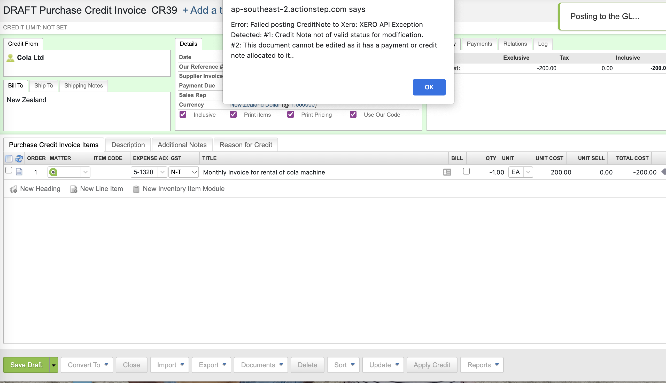 This creates a draft credit that is not linked back to Xero. If you try to save and close this credit, you will see an error message. To move the credit from draft to open you will need to turn off the Xero integration.
