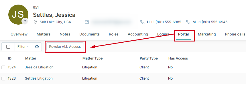 NOTE: If the client or user has access to multiple Client Portals, you can revoke their access to all portals at once and then re-enable their access for each individual matter, which will update the email address used to access the portal. To do this, edit the contact record and click the Portal tab. Then click Revoke ALL Access.