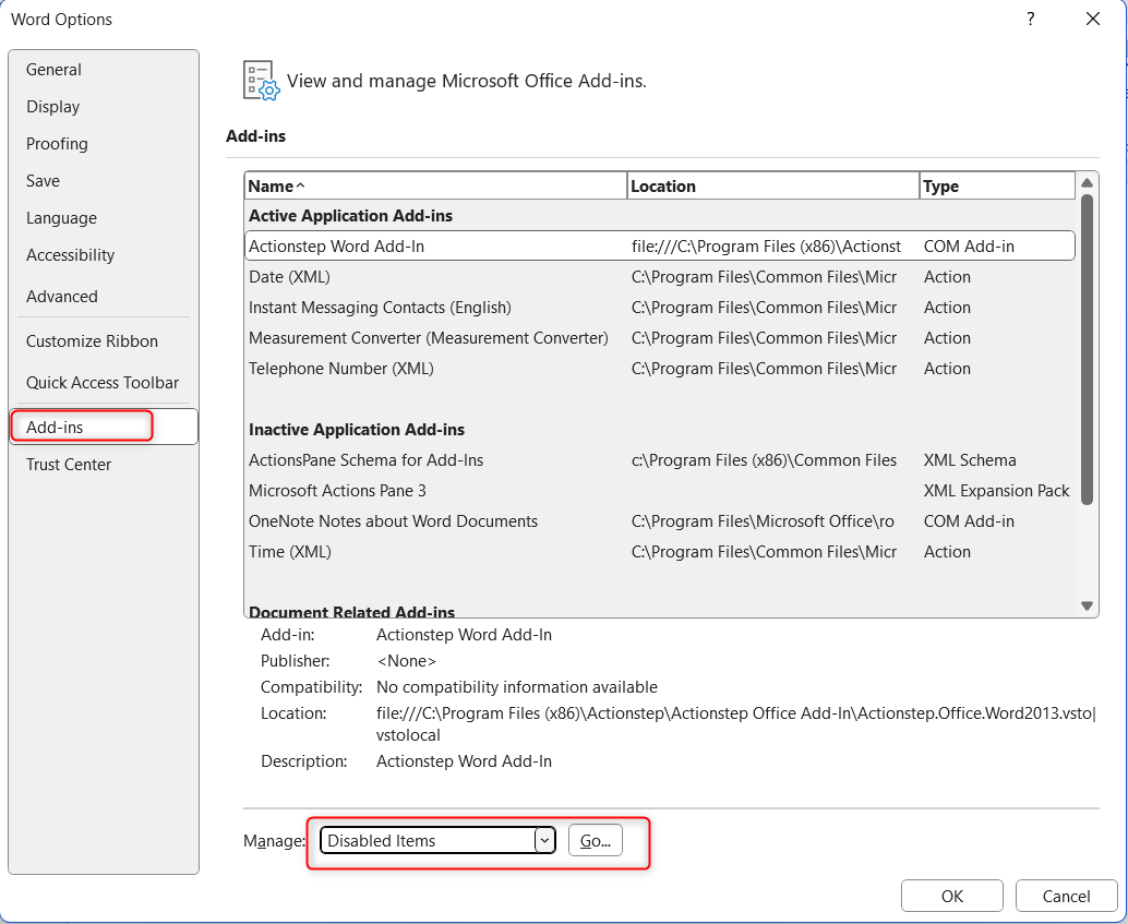 - Click the Manage drop-down list and select Disabled Items and click Go.