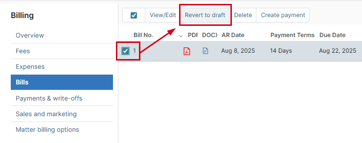 Occasionally, you may need to revert a produced invoice/bill to a draft version, make a change, and then re-finalize that invoice. You can only revert and update invoices that are still within the timeframe before accounting lockout.