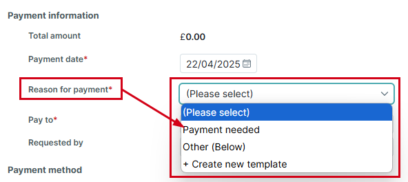 You can define one or more responses to be used as Reason for [trust transaction type] fields within trust accounting. For example, when creating a trust payment, you can create a list of reasons that will be included in the Reason for payment drop-down list: